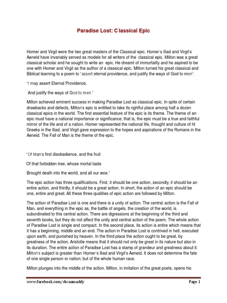 Paradise Lost As Classical Epic Or Classic Epic By John Milton Question Answer Pdf Paradise Lost Epic Poetry